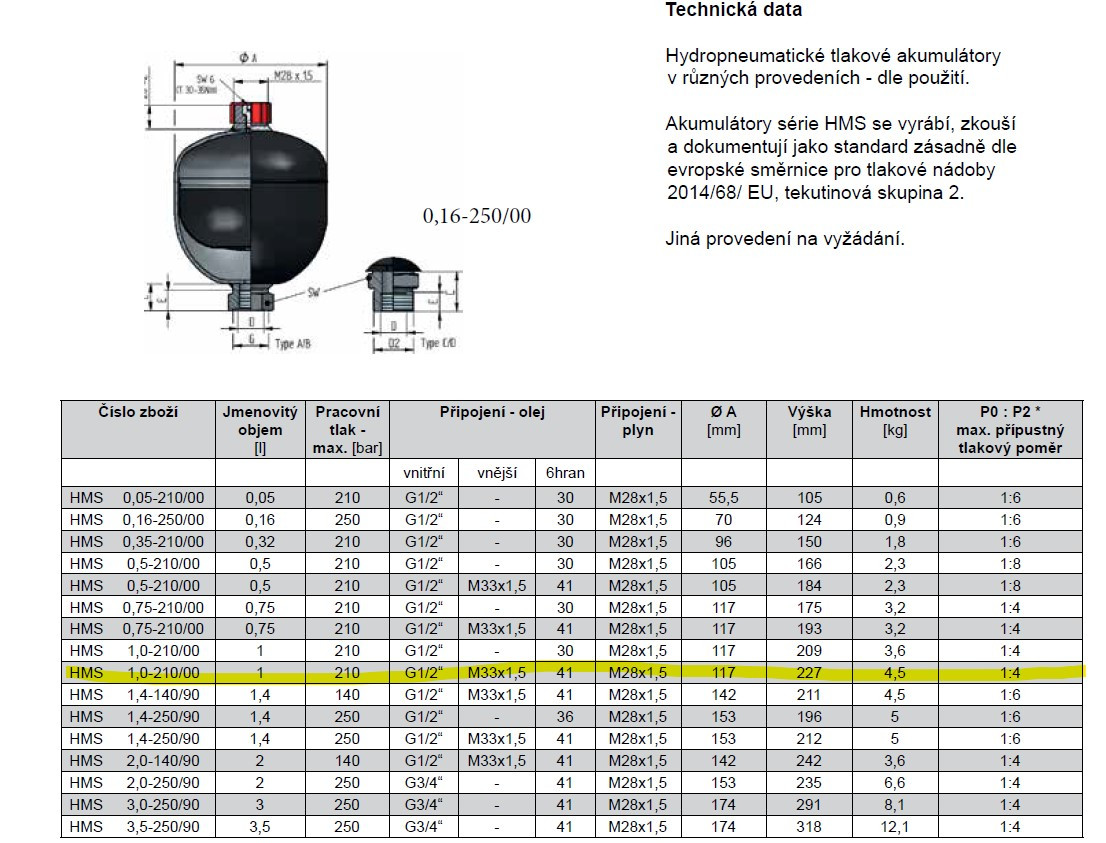 Membránový akumulátor - objem 1 liter - max. tlak do 210 barov... Celý popis