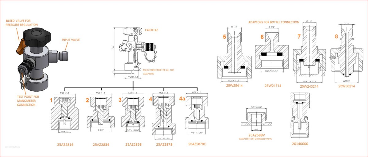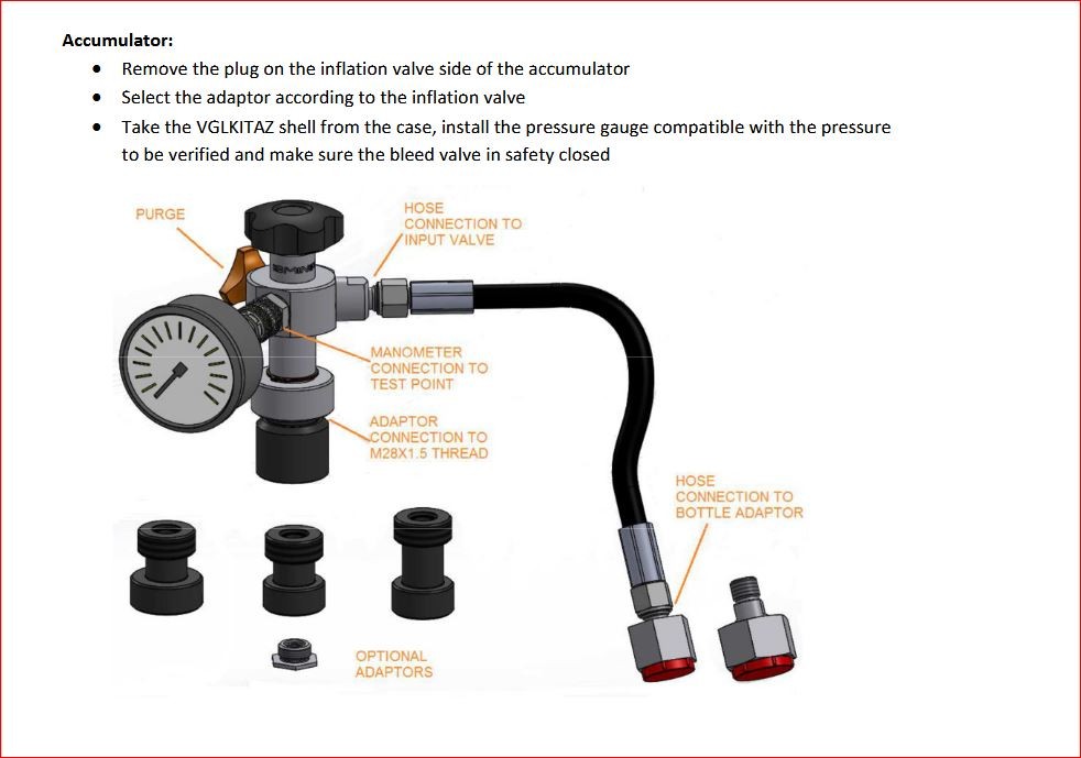 Použitím redukcií zahrnutých v súprave sa môžete prispôsobiť väčšine výrobcov hydraulických akumulátorov na trhu (HYDAC, OLAER, PARKER, REXROTH, EPE, SAIP, FOX, OMT atď.).