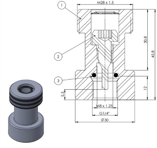 Hlavný prvok nastavovacieho tlaku - regulačný ventil - je prostredníctvom hadice M28x1,5 / závit spojený s hydraulickým akumulátorom a dusíkovým valcom cez hadicu. Tento ventil má zabudovaný spätný ventil, pripojenie tlakomeru a ventil na reguláciu tlaku.