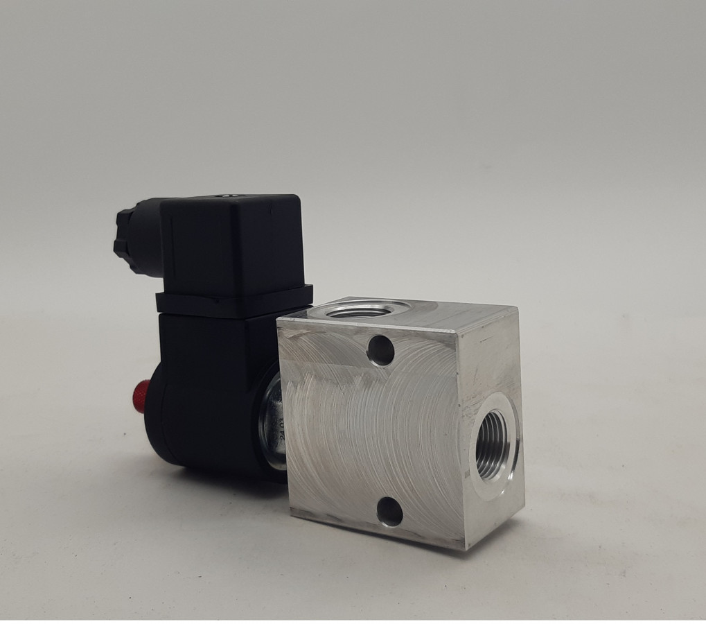 Elektricky ovládaný dvojcestný ventil 12V, typu "zatvoriť / otvoriť" sa používa na blokovanie toku oleja na jednej hydraulickej linke.
