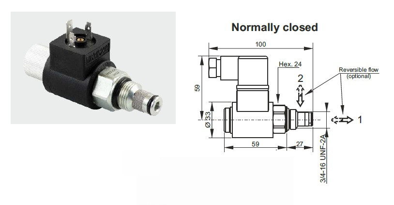 Elektricky ovládaný dvojcestný ventil 12V, typu "zatvoriť / otvoriť" sa používa na blokovanie toku oleja na jednej hydraulickej linke.