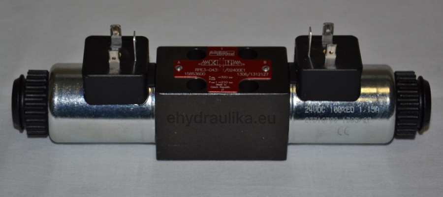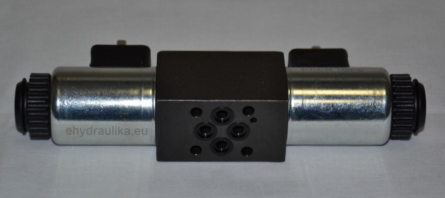 Dvojcievkový 4/3 hydraulický rozvádzač, elektricky ovládaný, svetlosť DN 04, zástavba CETOP 2. Napätie na cievkach 24VDC. Konektory nie sú súčasťou ventila. Šupátko centrované pružinou, v stredovej polohe port P uzavretý, porty A,B prepojené s portom T.