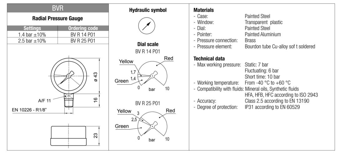 BVR14P01 je vizuálny indikátor zanesenia filtra. Nastavený tlak ukazovateľa je 1,4 bar.