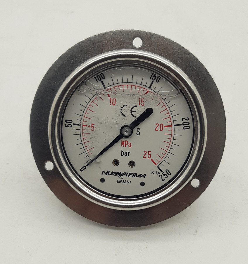 Glycerínový manometer s rozsahom 0-250 bar, priemer 63mm, pripojovací závit G1/4", zadný vývod s prírubou
